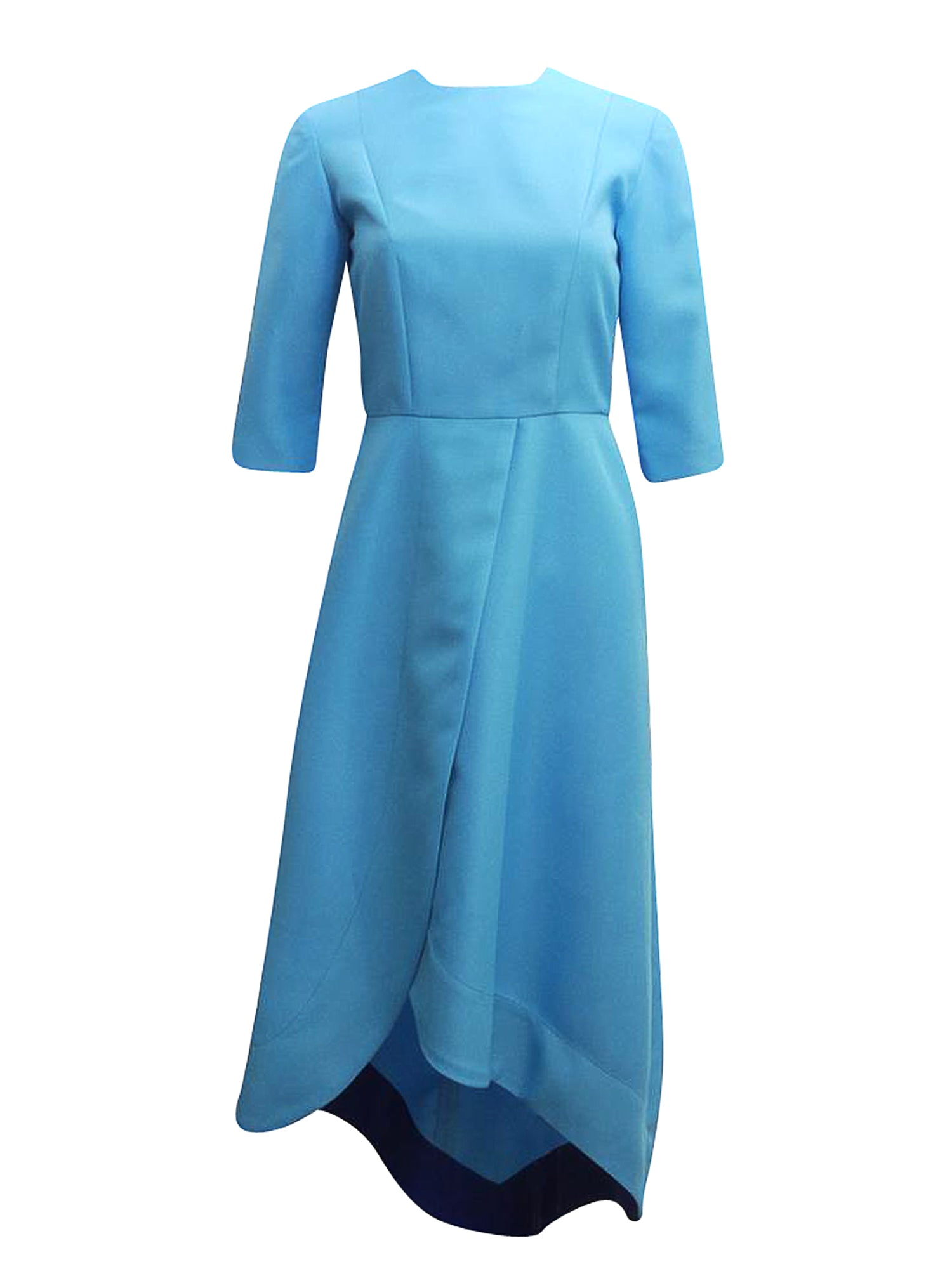 Dressy fabric 3/4 sleeve dress, skirt crosses over down the front with a high-low bottom hem of contrast color