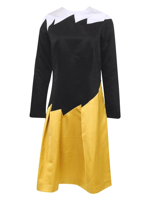 Colorblocked A-line dress with diagonal stairwell pleat.