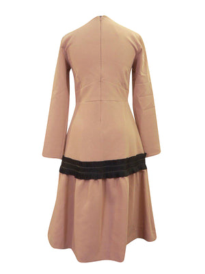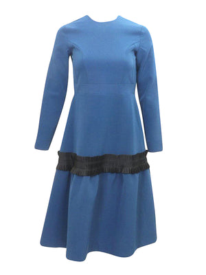 Crew-neck long sleeve dress with structured fitted top and a-line skirt. Skirt is accented with ruffle layered grosgrain band creating a drop waist effect.