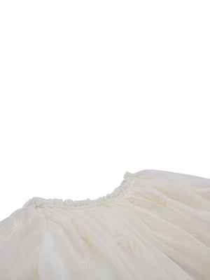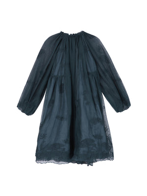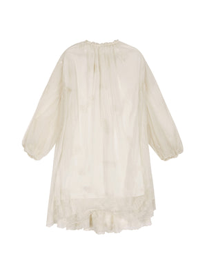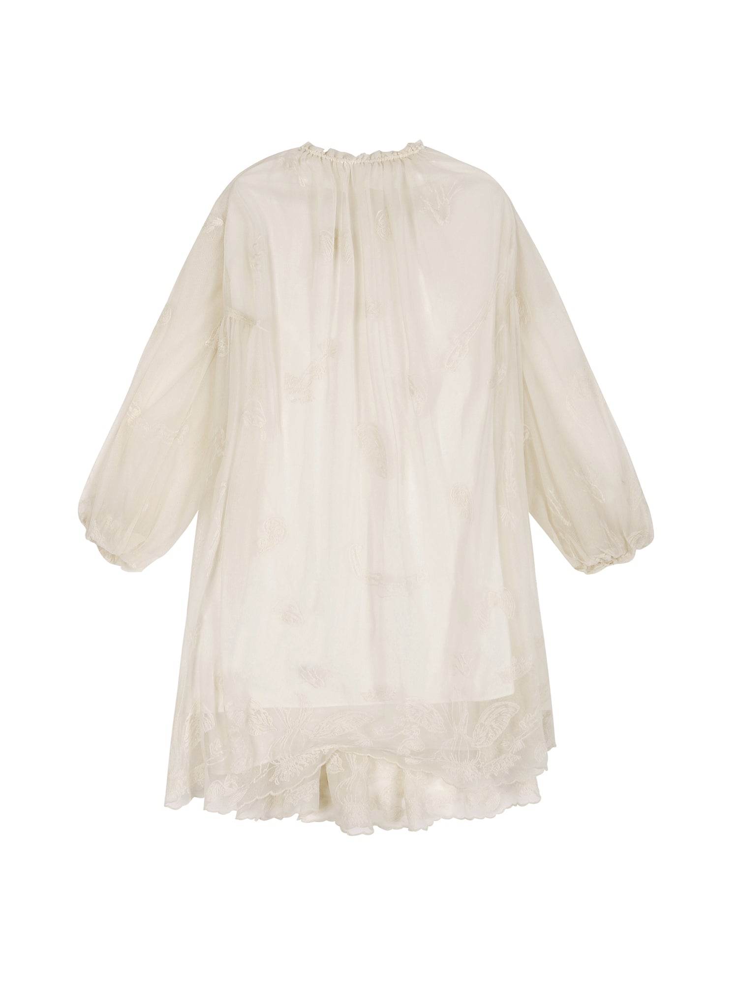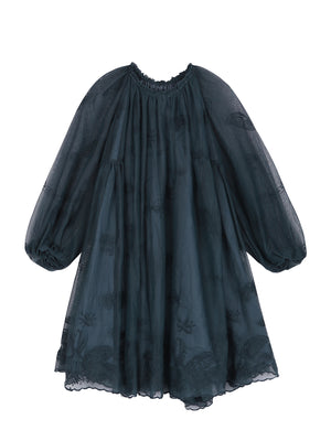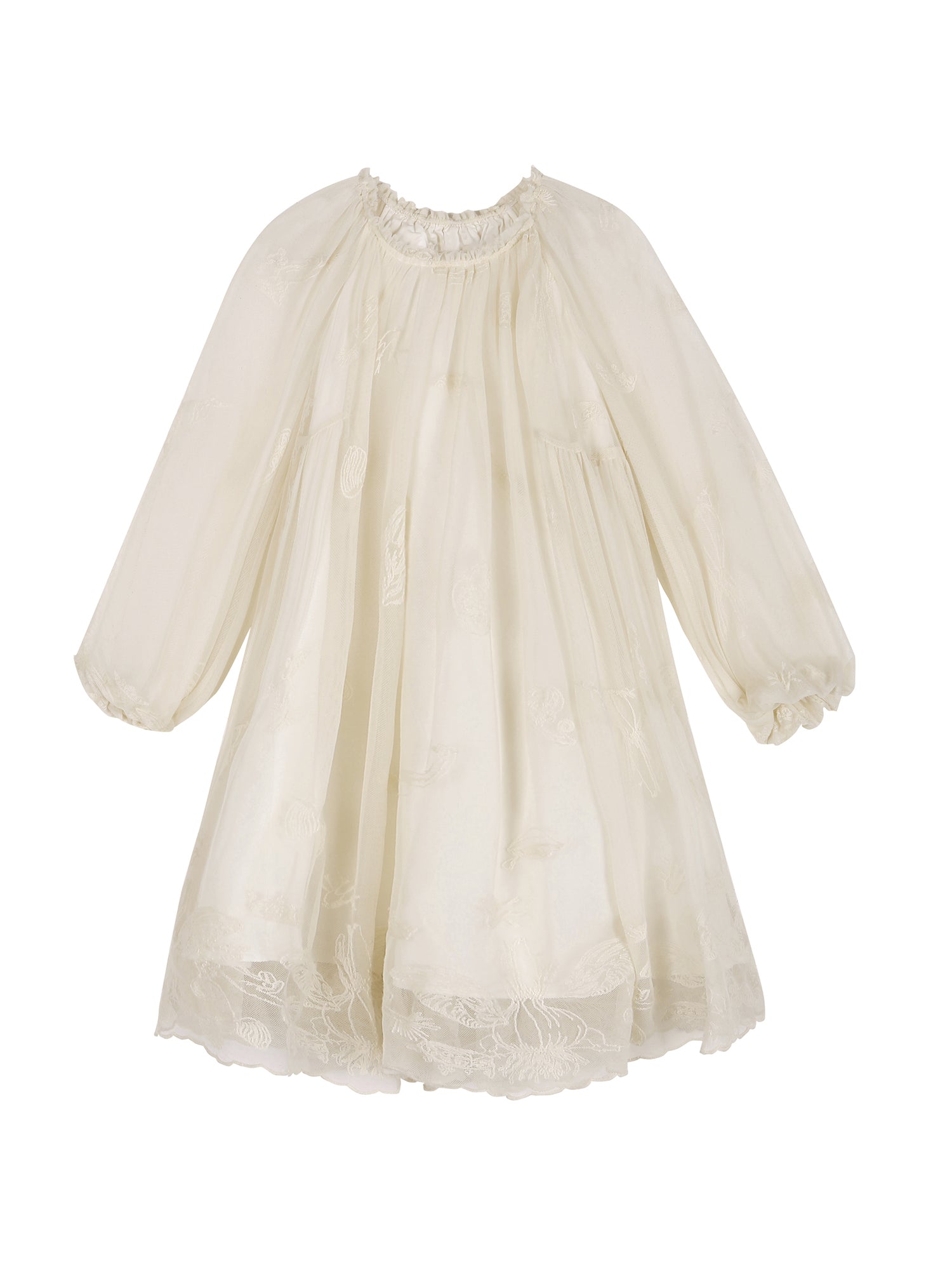 •LOOK: Flowy soft tulle dress with knit embroidered print all over. Comes in a soft cream and a navy. Flowy, lined, shift dress.