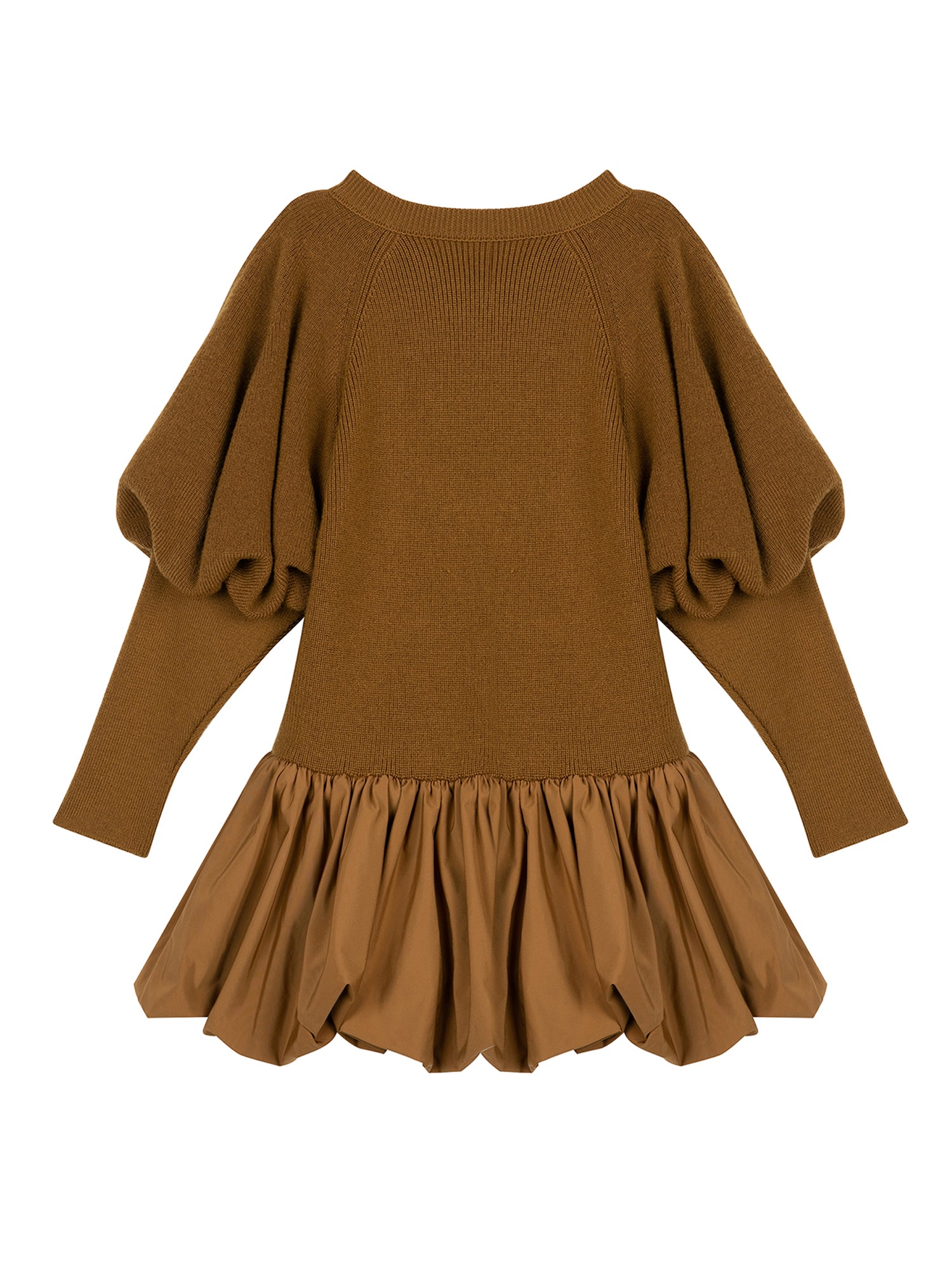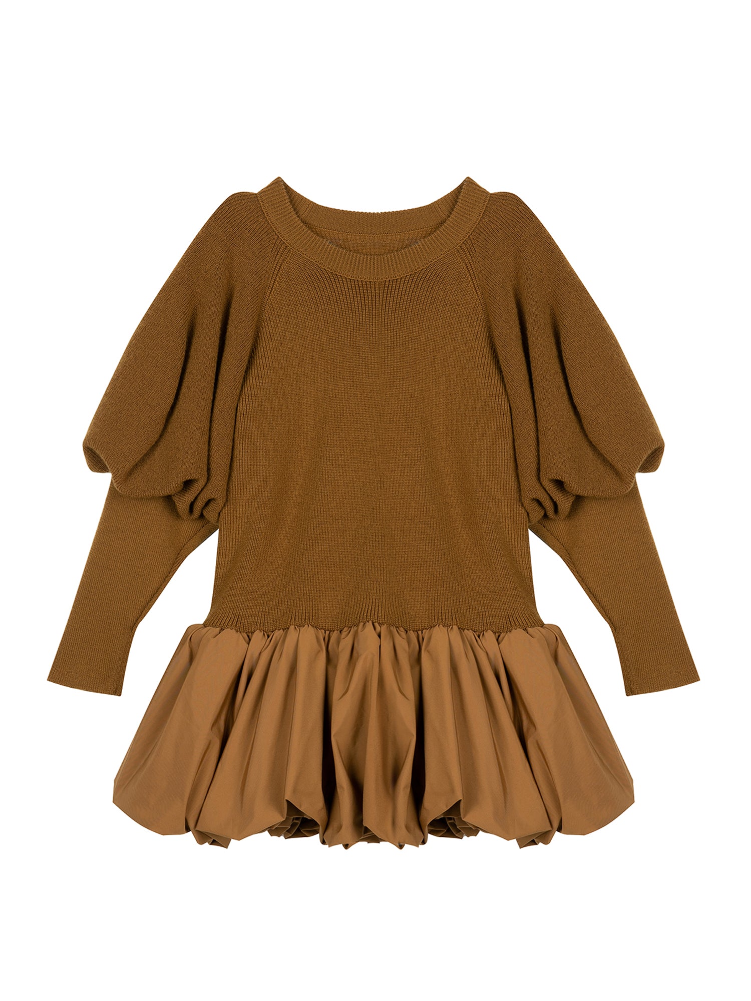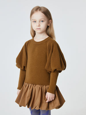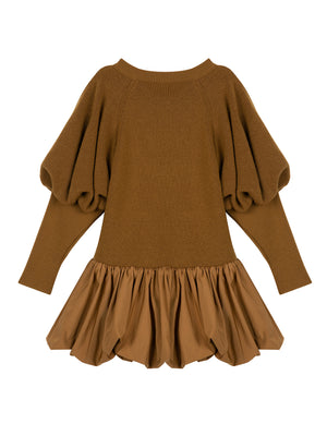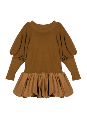 •LOOK: Sweater dressing with a twist. It starts off with a great sweater, crew neck, pull on style. The upper portion of the long sleeves is full and voluminous but tapers to the wrist for a streamlined look. The drop waist finishes with a fun and funky tier to match the balloon sleeves. Meant to be a dress but can also be a top over leggings or straight skirt. Be creative and have fun with this one.