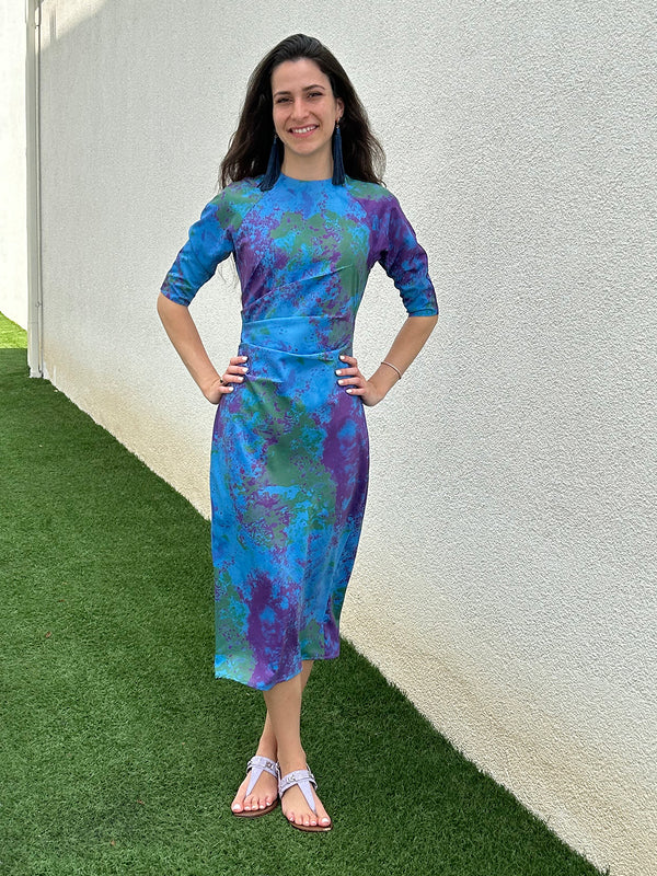 •LOOK: Bravo Legally Red for continuing to make women look fabulous. Here is a simply designed silk dress with draping in just the right places to give shape and style to the wearer. It is midi length, with a flattering, rounded neckline and elbow length sleeves. The hidden back zipper allows for easy overhead access. The fabric is silky soft in a subtle floral pattern that is visually calm and soothing. Ideal choice for a special occasion, daytime or evening. Fully lined. Exquisite fit.