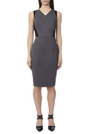 Sleeveless sheath jumper dress with slimming black accents on sides and back. Front is a charcoal grey color with two deep pockets in front. Great fit, skirt hits bellow the knee.