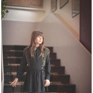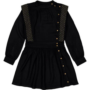 Raylon twill dress is a functional dress for any occasion. Cuffed arm links. Button-up accessibility makes for easy slip-on especially for toddlers. Pleated skirt and soft fabric. Gold criss cross detail are lined as shoulder straps ending at the waist.