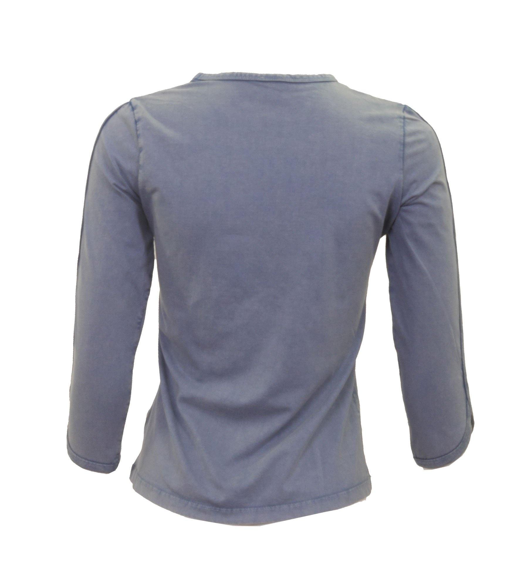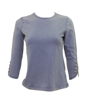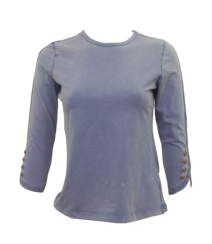 Vintage denim wash crew-neck t-shirt with nailhead buttons on sleeve . Junior sizing.