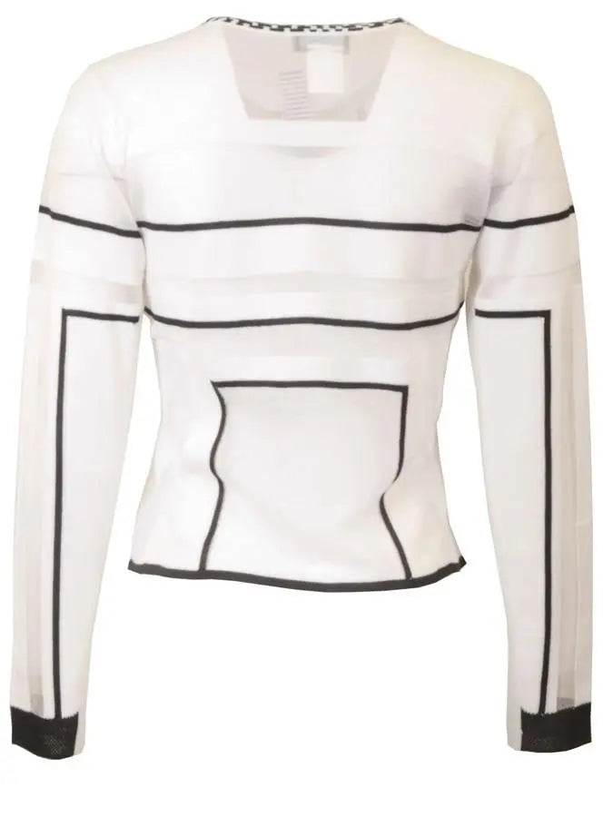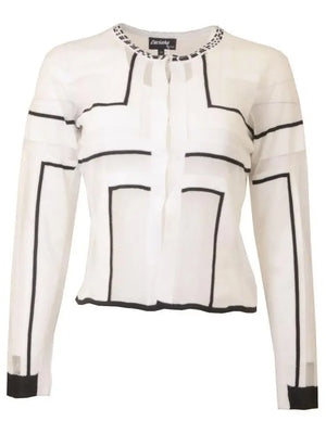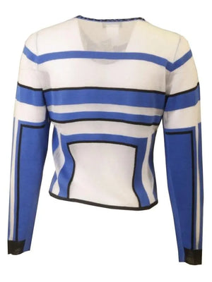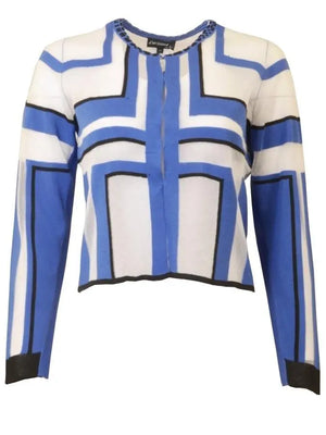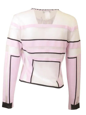 Long sleeved sheer knit sweater with hook closures, colorful geometric abstract linear patterns mix with a shimmery sheer knit cardigan, makes a great lightweight top.