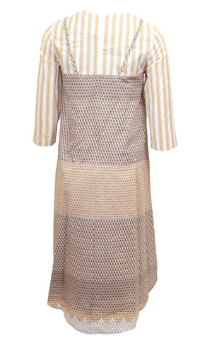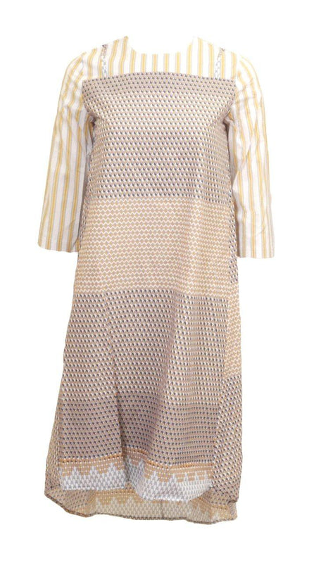 Printed mock-jumper dress. Navy and yellow striped top and sleeves. Navy grey and yellow overall print,. Hi-low bottom, A-line with three quarter sleeves.