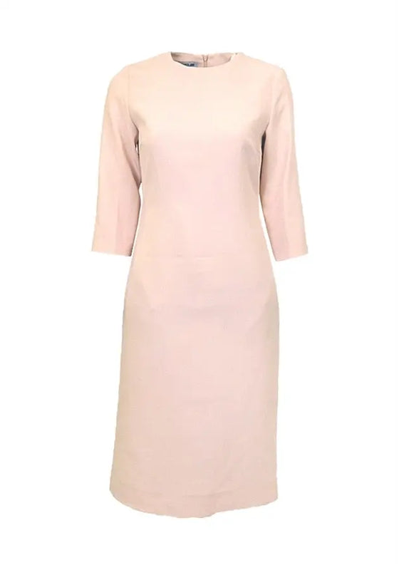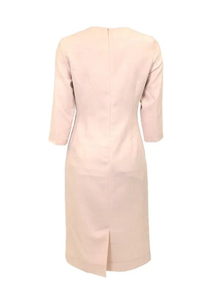 Elegant straight peach sheath dress with a kick pleat in the back.