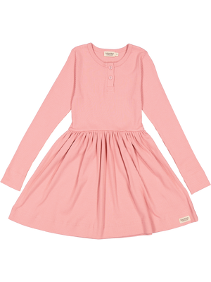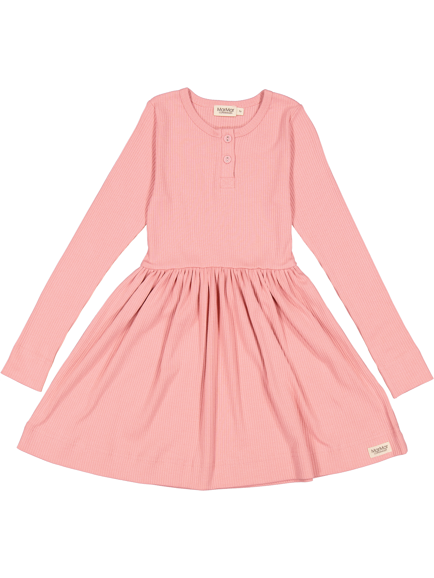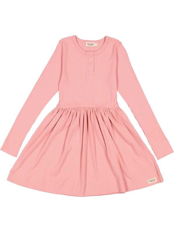 Long-sleeved dress with button closure and a cute skirt. The length of the dress goes above the knee