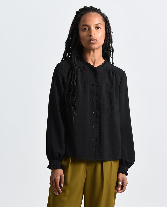 •LOOK: Sweet, subtle and stylish. This button down blouse with feminine ruffles slightly peeking through the placket and gently framing the neck is a must have for your wardrobe. It can dress up a pair of jeans or elevate your work attire to another level. Your impeccable taste will be admired when you show up wearing this beauty.