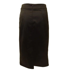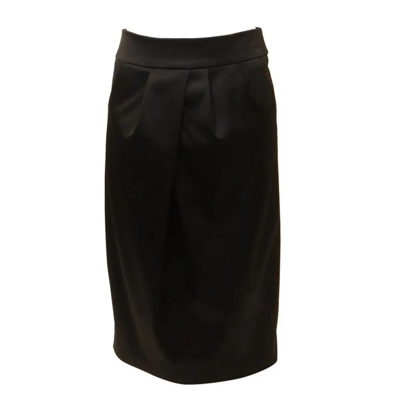 Black satin skirt with gathered wrap pleat front design (very classy), slight a-line.