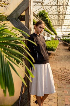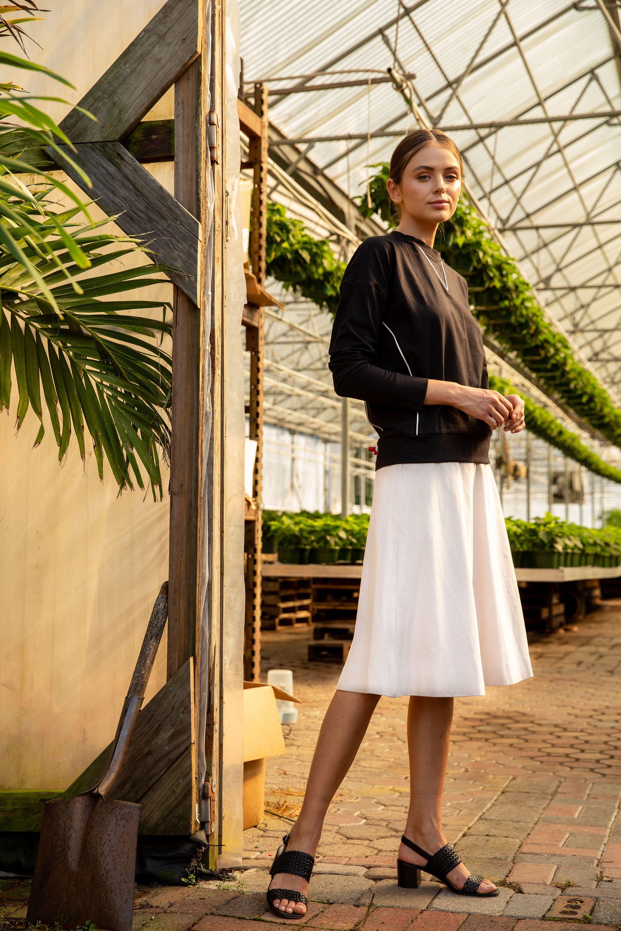 This Classic Set Skirt is the ultimate option to pair to any of NOD’s crews as well as to any article of clothing that you already own. With our additional feature of the two inch hem, you can have it customized to your fit. For utmost practicality, it has a thin lining and side zipper closure. This piece will create the finishing touch to your everyday look.