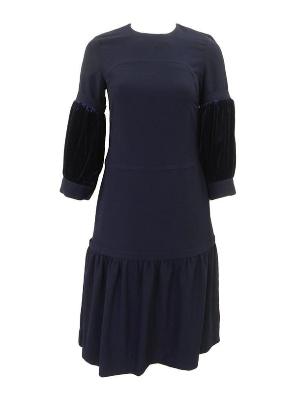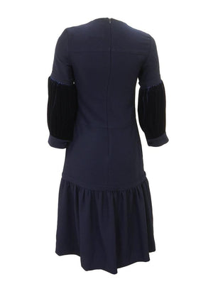 Noir leather fluted hem and velvet sleeve dress in blue. Zipper on the back and button on the cuffs.