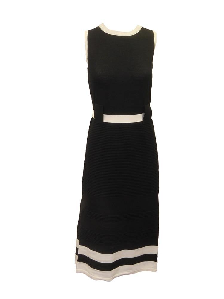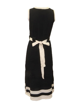 Lightweight knit sleeveless jumper with belted cinched waist, colorblock and ribbed contrasting horizontal stripe width. A-line skirt, black body with cream accents.