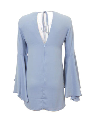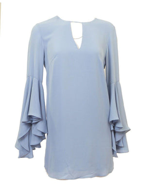 Perry Winkle blue v-neck tunic top with keyhole and tie neckline, sleeves 3/4 but with dramatic layered bell sleeve drape.