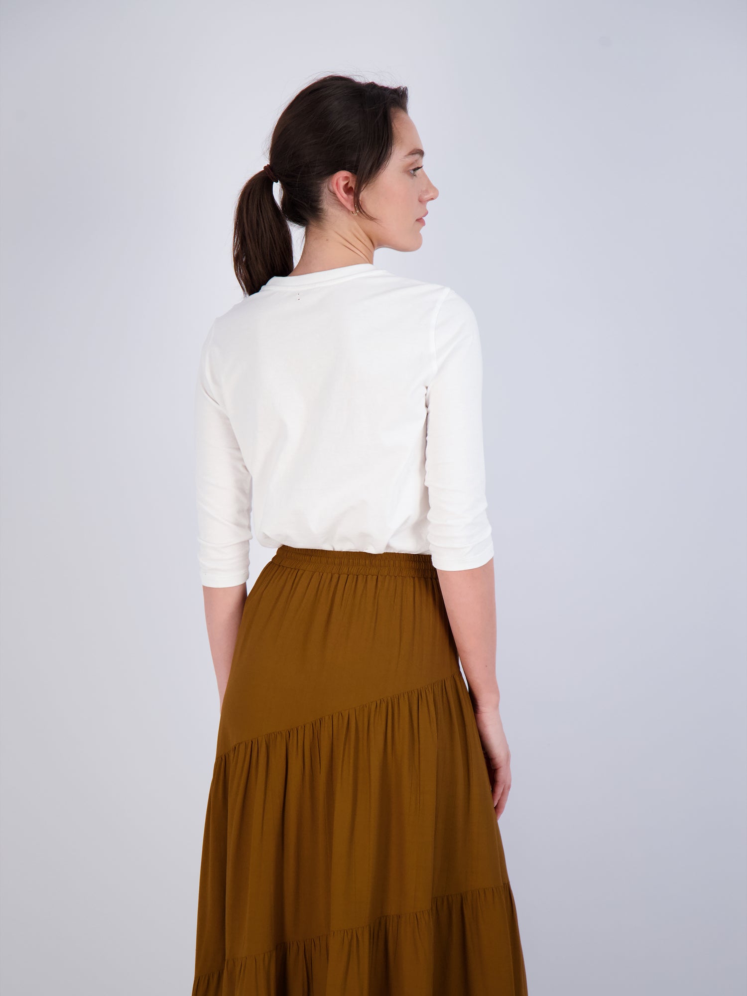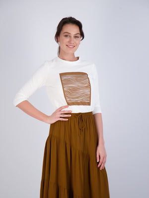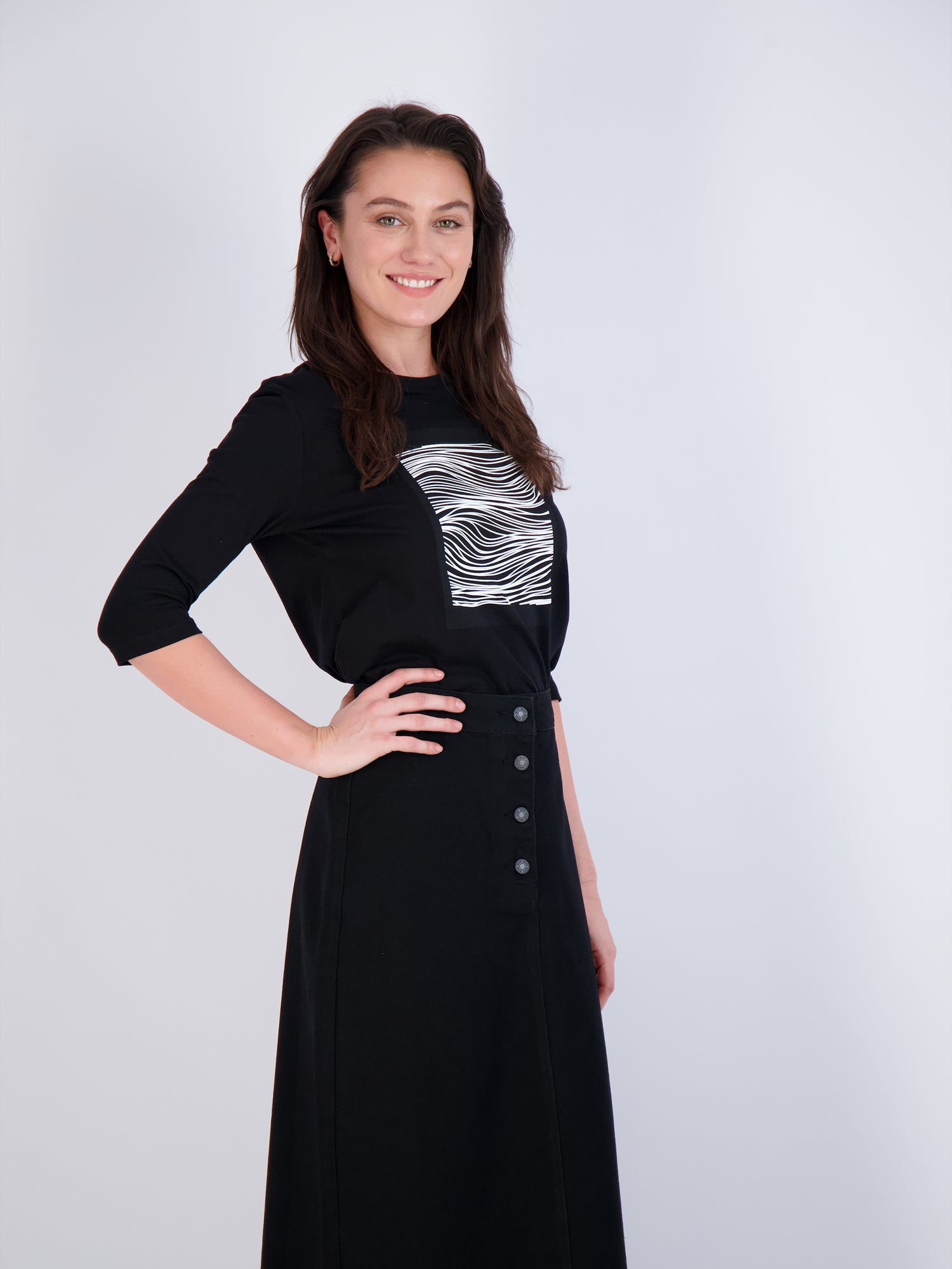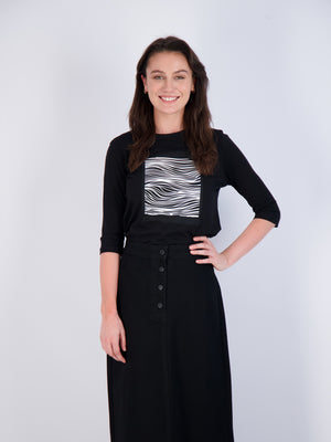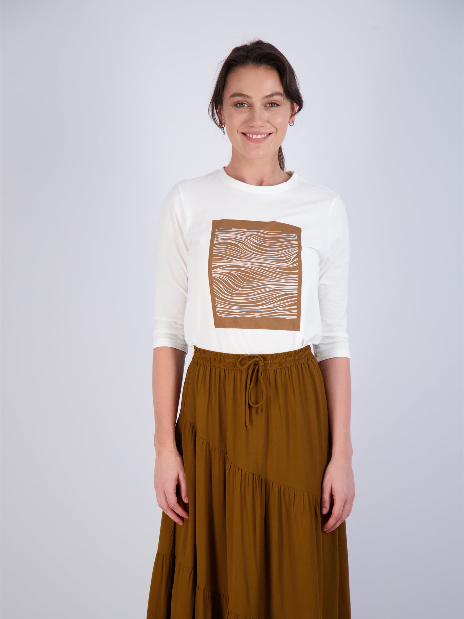 – Sold Out•LOOK: Tee shirts have become a year round item in every wardrobe because of the wearability and versatility. Your collection should have different colors, weights and sleeve lengths. Here is a tee from Pashmina that will draw you in with its eye catching graphic print. Created with a super soft touch and 3/4 sleeves, this is a feel good tee with each color bringing a different dramatic tone. Try them all. Add it to your collection and wear one every time you need a casual but stylish vibe.