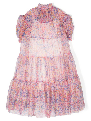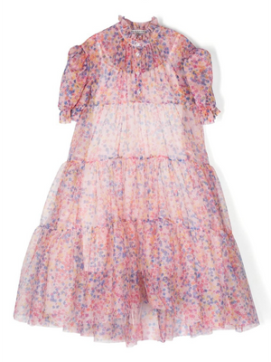 •LOOK: A party girl’s party dress. Layers of netting under a sheer overlay in a floral print. Buttons in back allow easy pull overhead access. A very feminine ruffle around the neck frames the face. Short sleeves in the same sheer overlay print. This is a fun dress that will match your party girl’s penchant to have a good time.