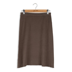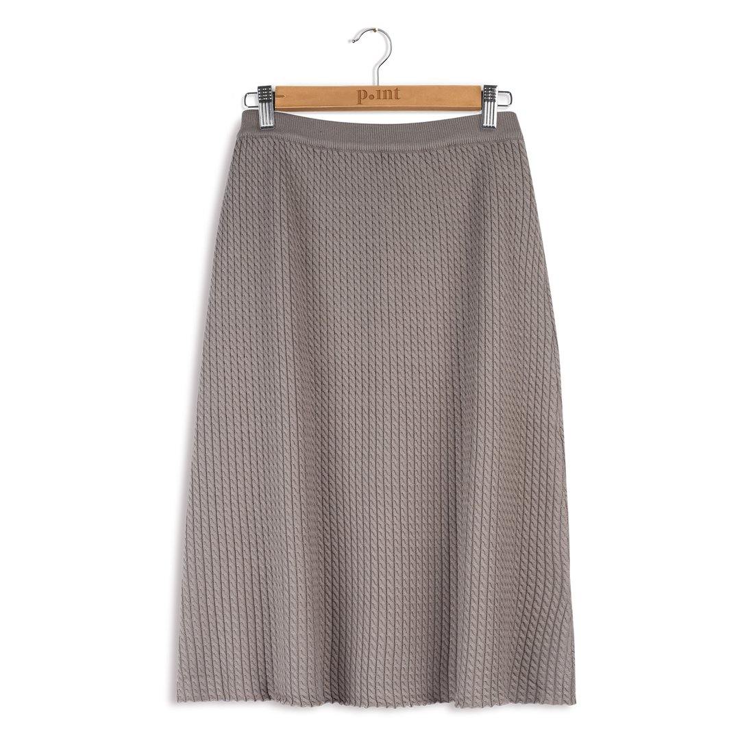 Pull on stretch knee length cable-knit sweater skirt. Stretch elastic waistband, great fit and with the perfect neutral tones for the fall. Transitional fall fashion with a slight a-line body. Has matching knit top to create a monochromatic set, or mix and match. Machine washable.