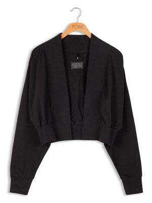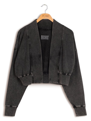 Be cool and comfortable in this Point black cropped bomber jacket sweater. Made from super soft cotton, this bomber cardigan has a washed look. Full drop sleeves with wide banding at the waist for structure. Wear it with one of our point tops or dresses, or style over a tee or tank dress. The options are endless.