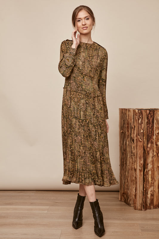 – Sold Out•LOOK: Get Fall vibes with this beautiful floral dress. The bodice has box pleats in the front, a fitted wide waist, and a full swing pleated bottom . Slight puff sleeves complete the look.Midi length .