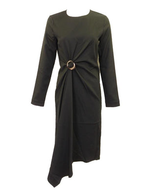Long sleeve lightweight sheath dress with gathered gold belt hoop creating an cinched waistline. Hidden zipper, asymmetrical design with longer fabric at gathered hem-line.