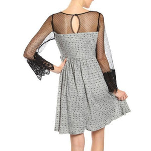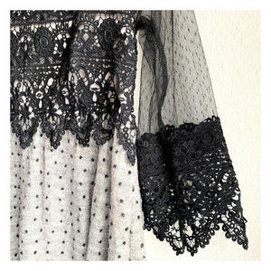 Ryu dress with grey polka dot full skirt, black lace bodice and sheer sleeves with lace trim.