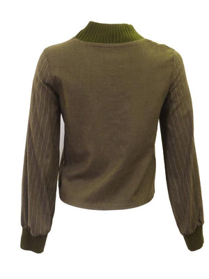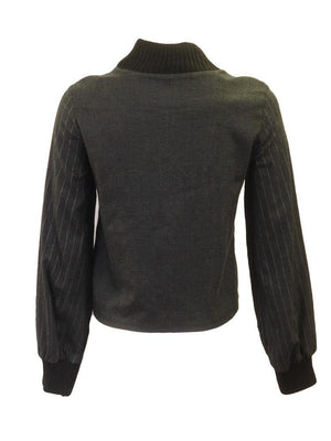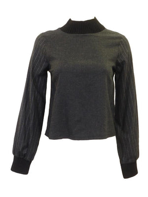 Mock neck top with pinstripe sleeves and sweater fabric cuff and neck, looser fit, slightly cropped