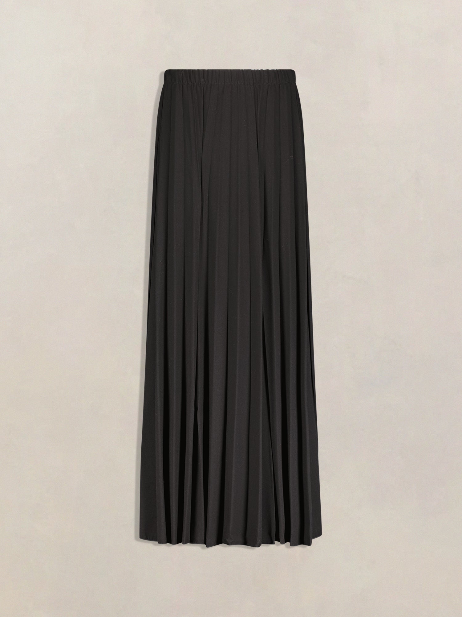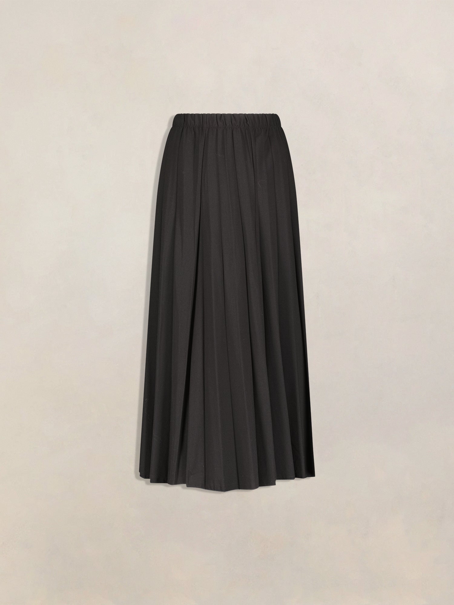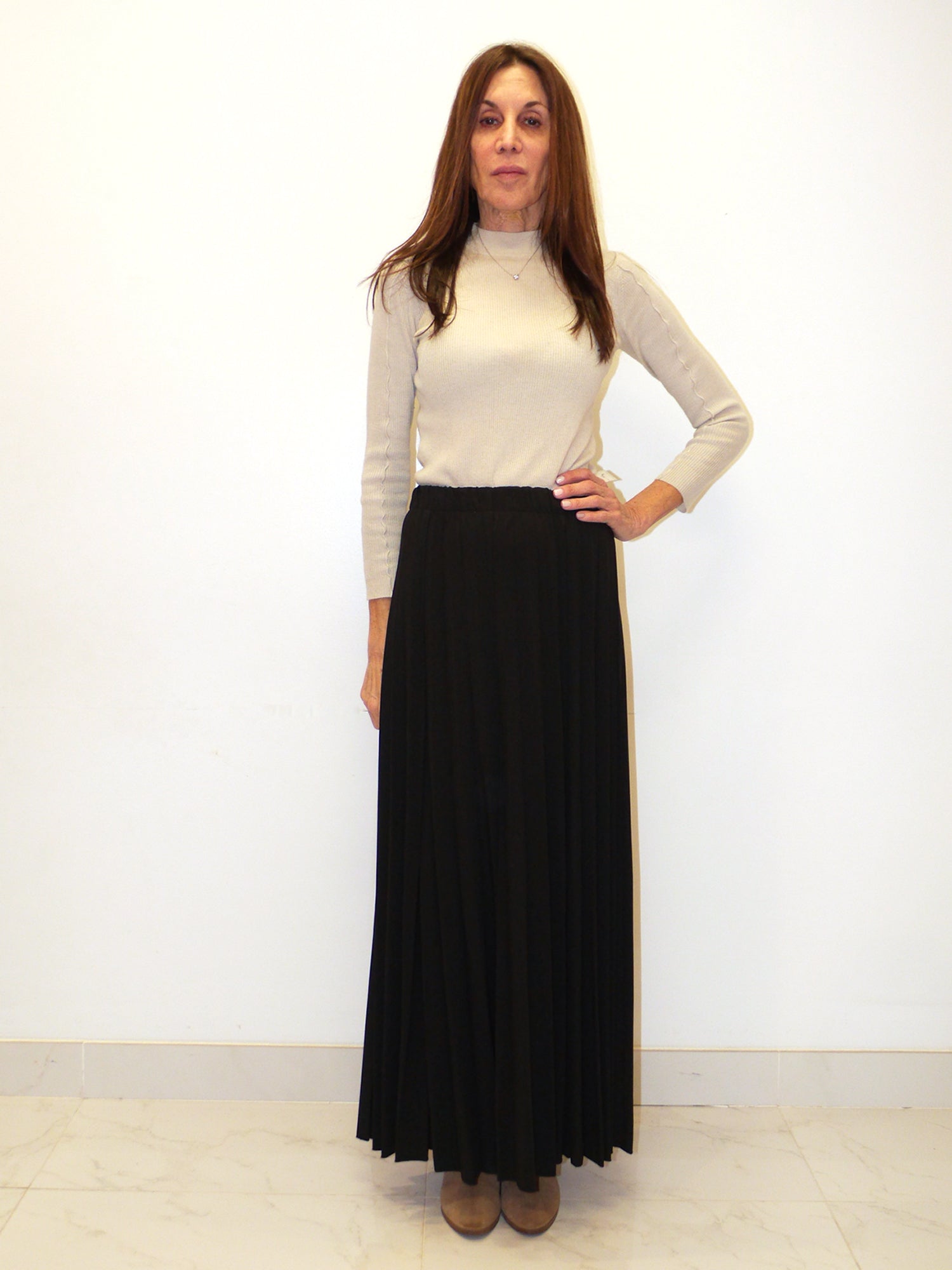•LOOK: Sam Fashion designed a fabulous skirt in a pull on style with an elastic waistband. The suiting fabric is smooth, non-stretch. There are three lengths available: knee, midi and maxi. All-around pleats add to the visual appeal and graceful movement. Wear this with a fave sweater, a trendy cropped style sweater or a new cardi you have your eye on but didn't have anything to wear it with. Problem solved! This skirt is a workhorse staple in your wardrobe. It is both versatile and practical. Each length gives you a different look so don't hesitate to try them all. Work, casual gatherings with friends or special events. This skirt will look new and exciting every time. Available in black or olive.