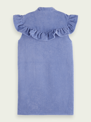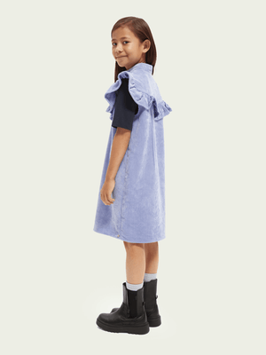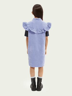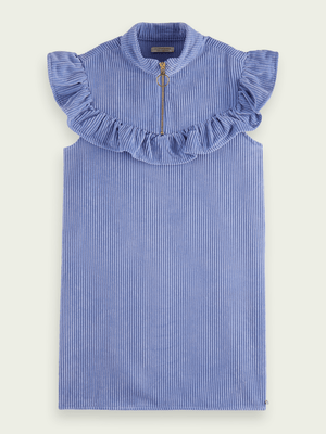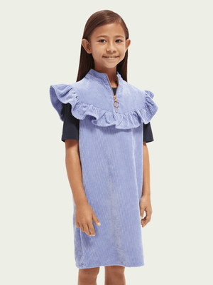 Cut with a ruffled yoke, our corduroy dress is finished with half-zip closure—layer over a long sleeve for a perfect and complete seasonal outfit.