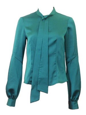 Rich teal color long bubble sleeve blouse with tie at the neck