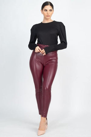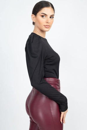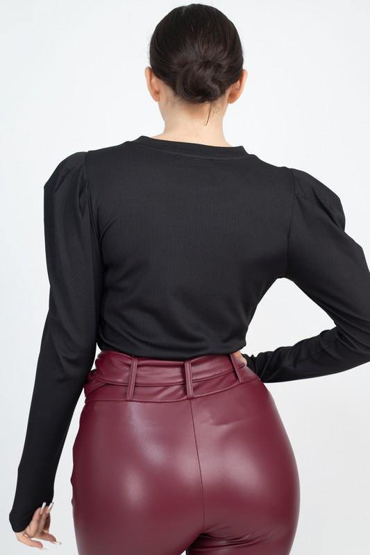 A knit shirt featuring long puff sleeves, mock neck, and a fitted silhouette. 92% Polyester 8% Spandex