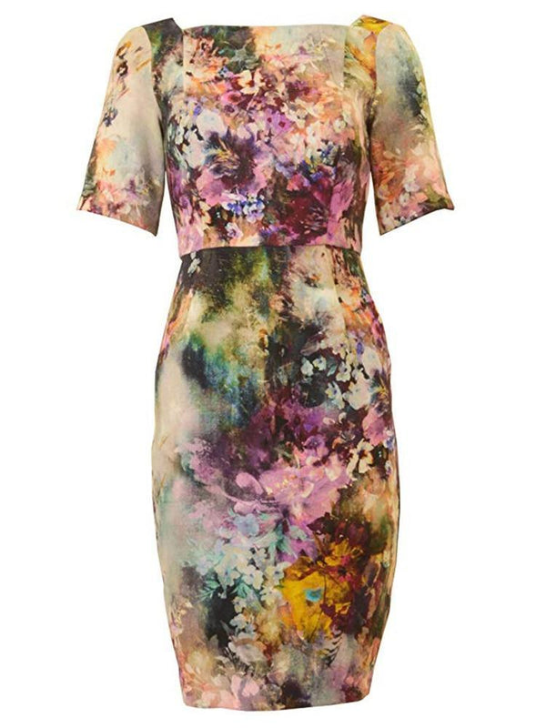 Floral Print Sheath dress with short sleeves. This dress has a wide boat neck that dips in the back and a kick pleat at the bottom.