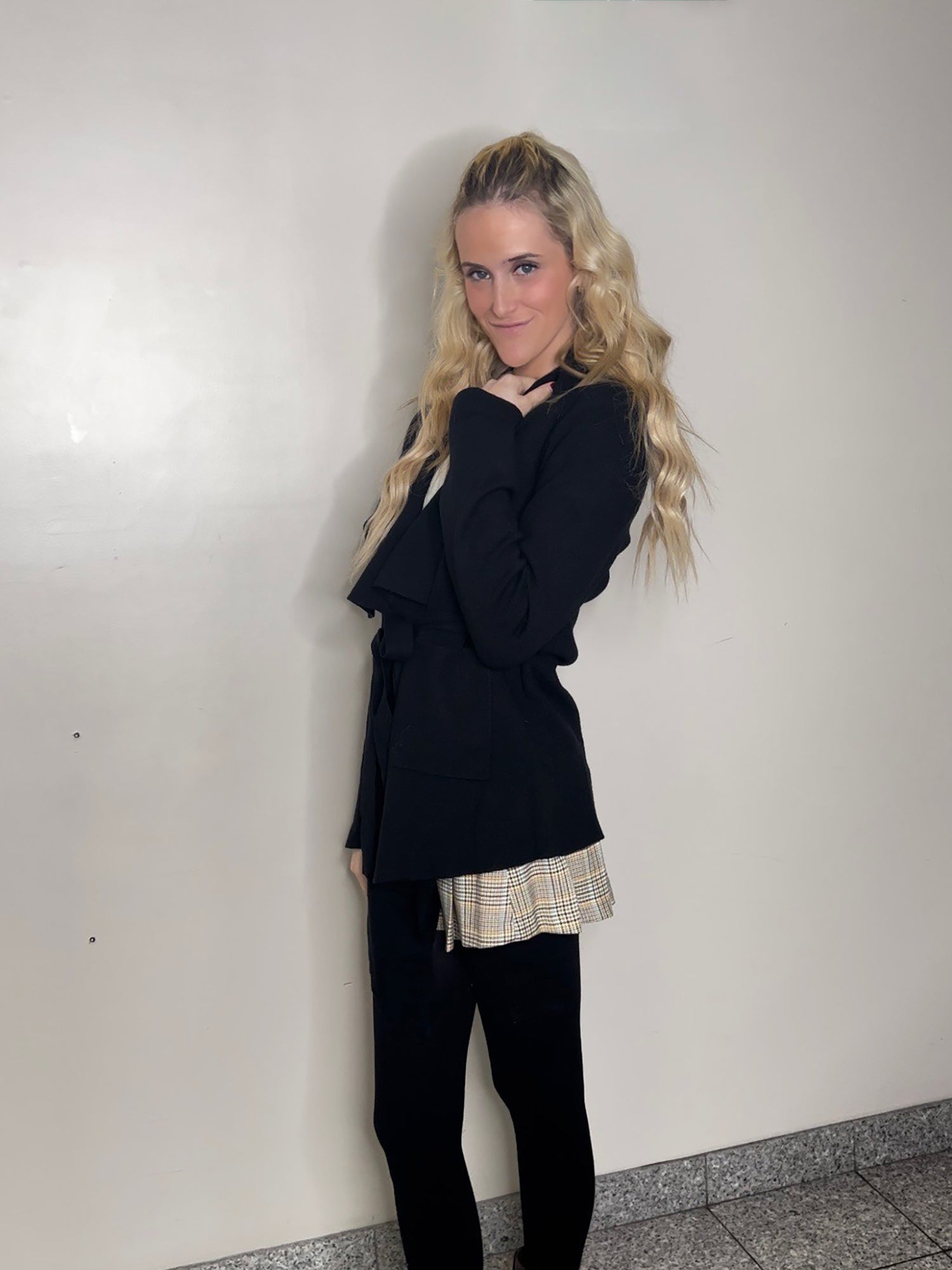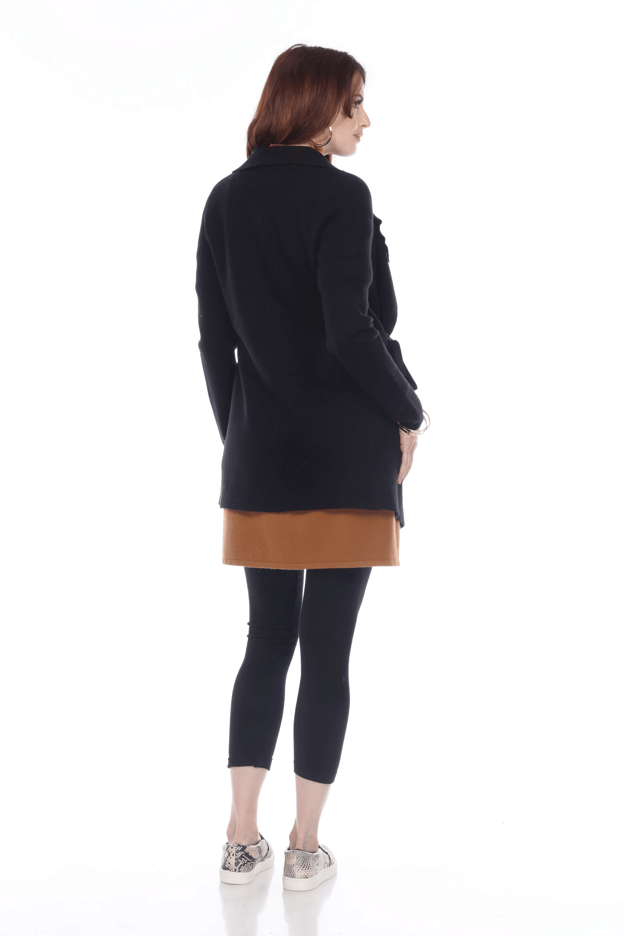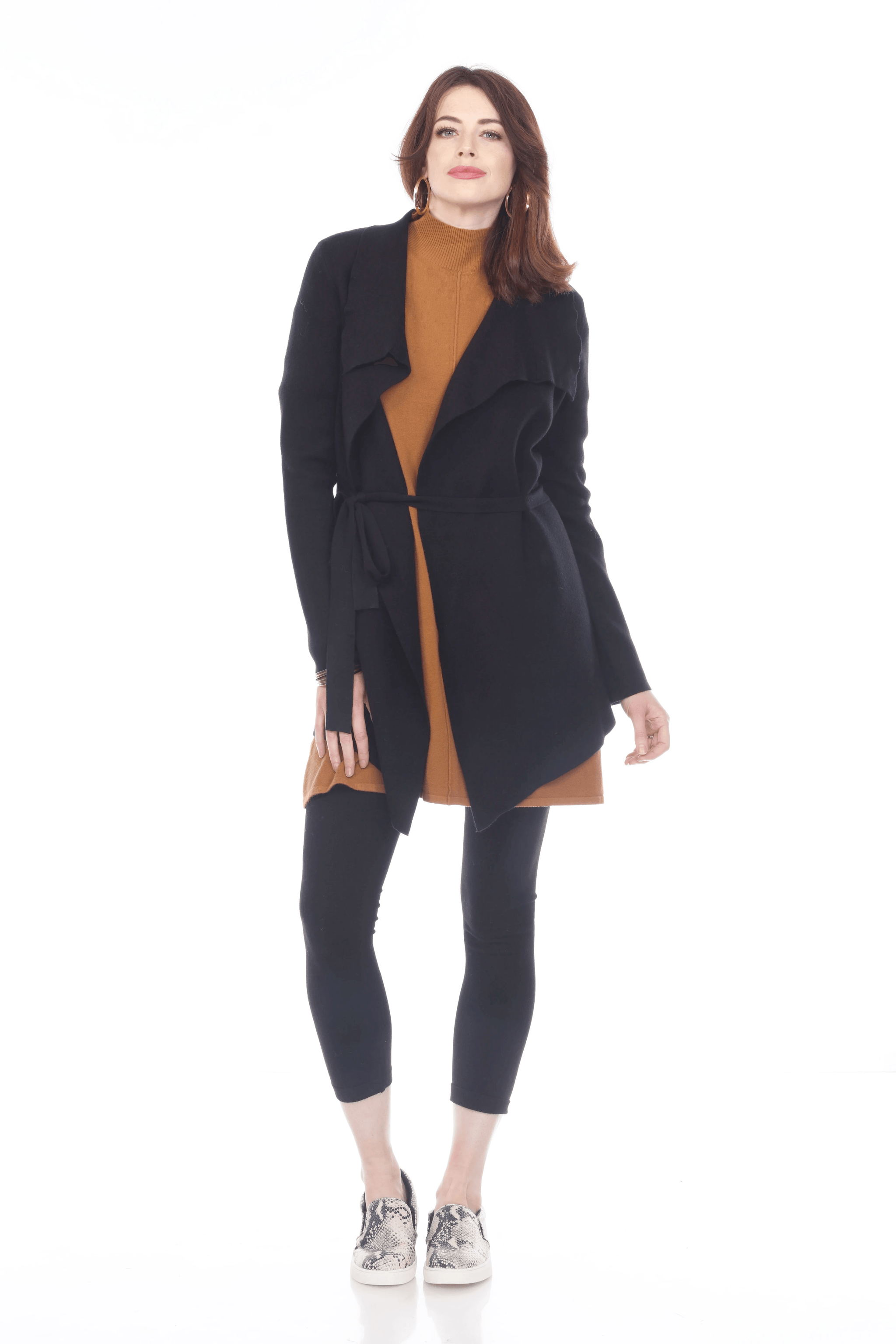 Long sleeve winter knit fly away open face cardigan, dual pocket front with attached belt.