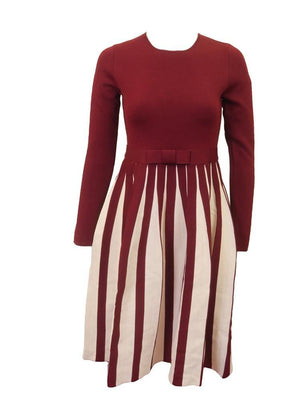 Juniors crew-neck heavy knit burgundy a-line dress with pleated contrasting color skirt. Belted waist, stretch pull on.