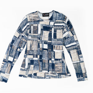 Beige, navy and white color combination of geometric print. Dolman sleeves, lightweight fabric, everyday wear top.
