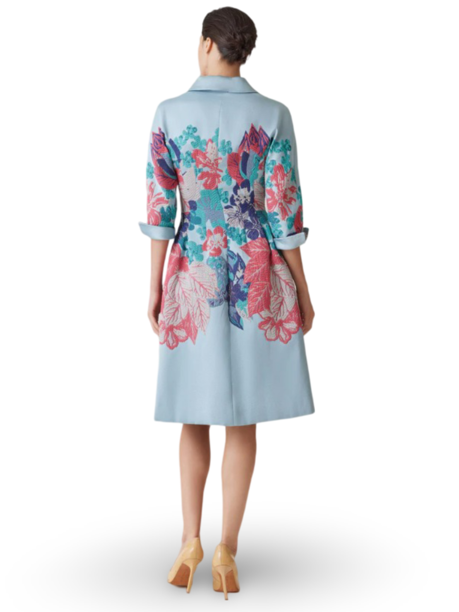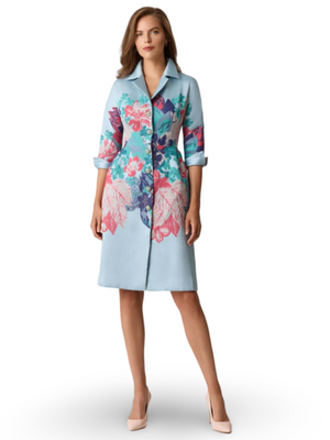 Description - Elevate your wardrobe with the Teri Jon Floral Tailored Coatdress. Featuring a sleek A-line skirt and structured collar, this below-the-knee dress combines timeless elegance with modern floral jacquard design. The button-down front and rolled-up sleeves add a touch of sophistication and versatility. Perfect for both professional and evening wear, this dress is a must-have for refined, stylish women.