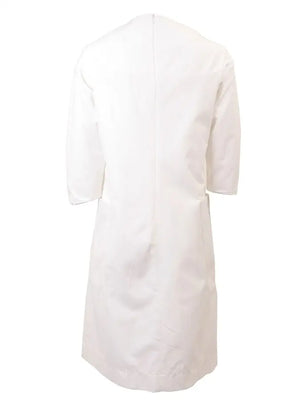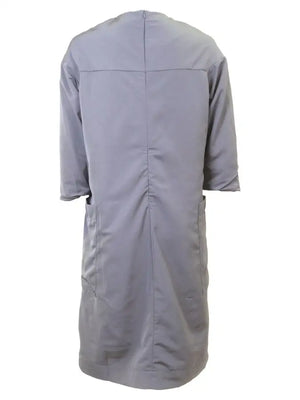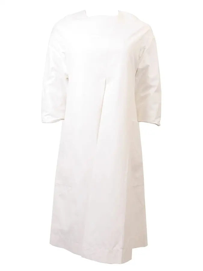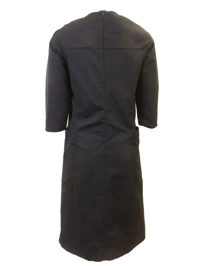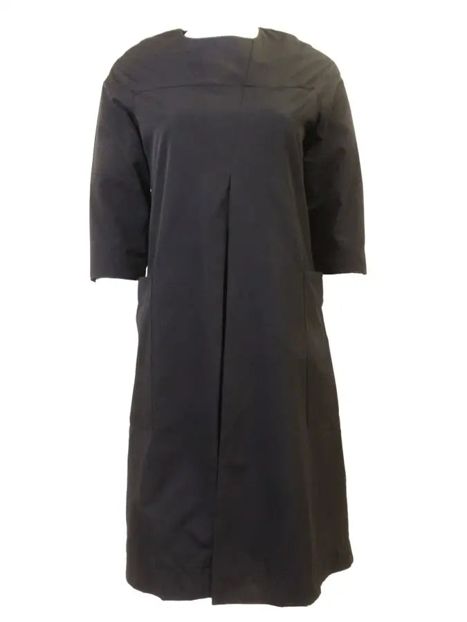 Rainwear fabric three quarter sleeved a-line dress with asymmetrical front pleat and deep hip pockets. Fully Lined