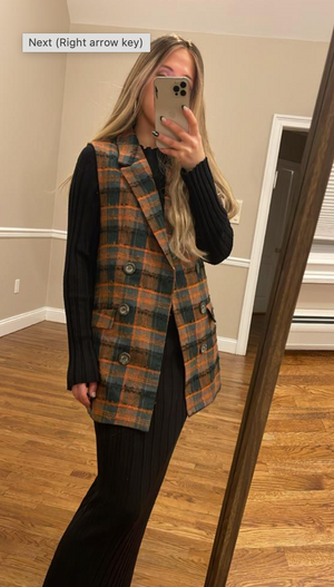 •LOOK: Menswear takes center stage! With a feminine edge of course. Such a cool looking plaid vest that is loose fitting, falls below the hips with non-working buttons to allow an open and free drape. Looks great with a turtleneck for work over a skirt, straight cut dress, pants or to hang with the girls in jeans and boots. Stylish look to show off your edgy side.