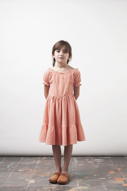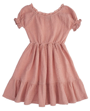 Short sleeve girls knee-length dress featuring a ruffled neckline top and elastic waistband, made of beautiful eyelet fabric.