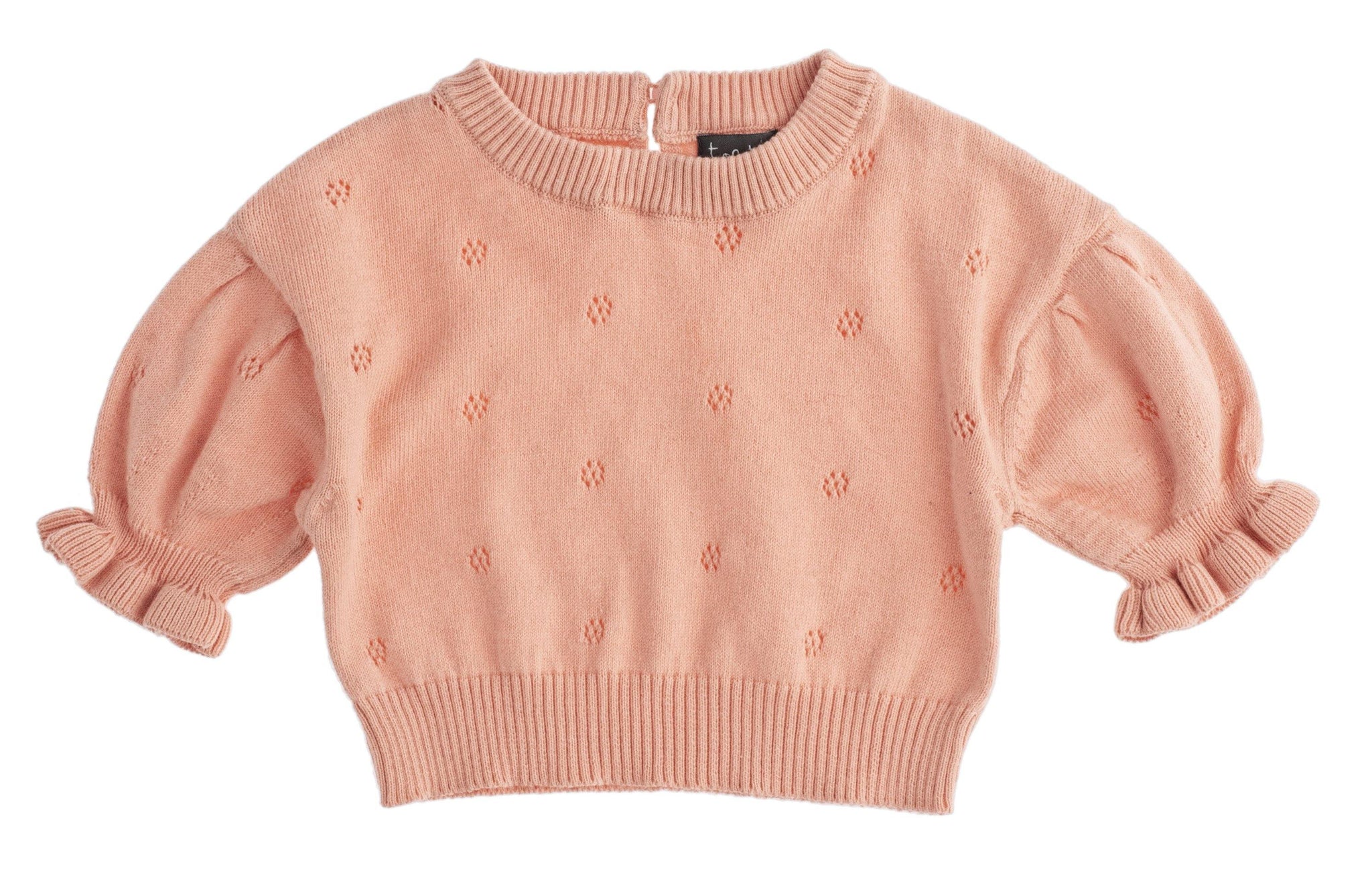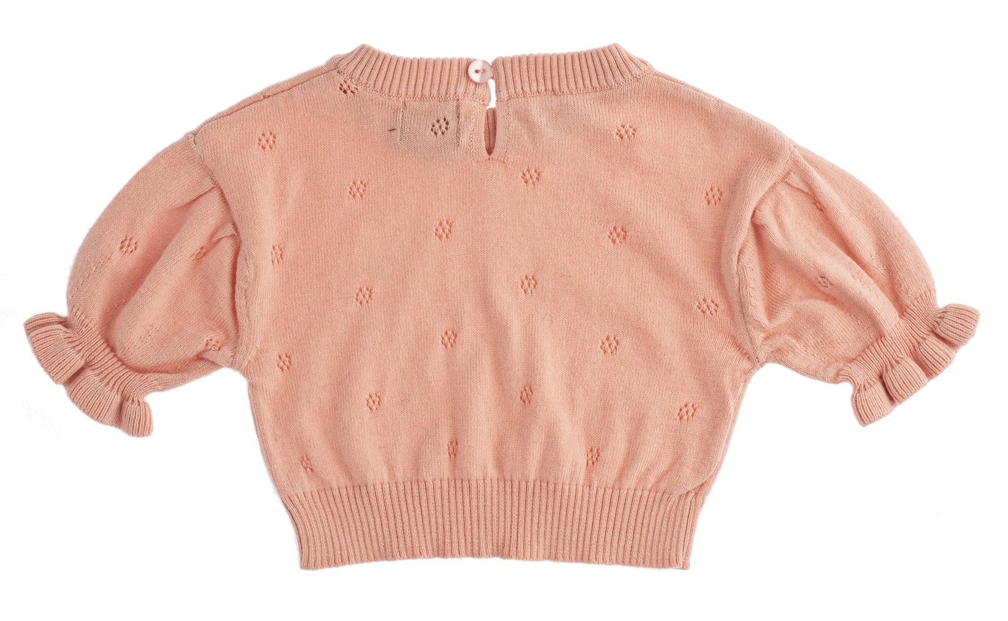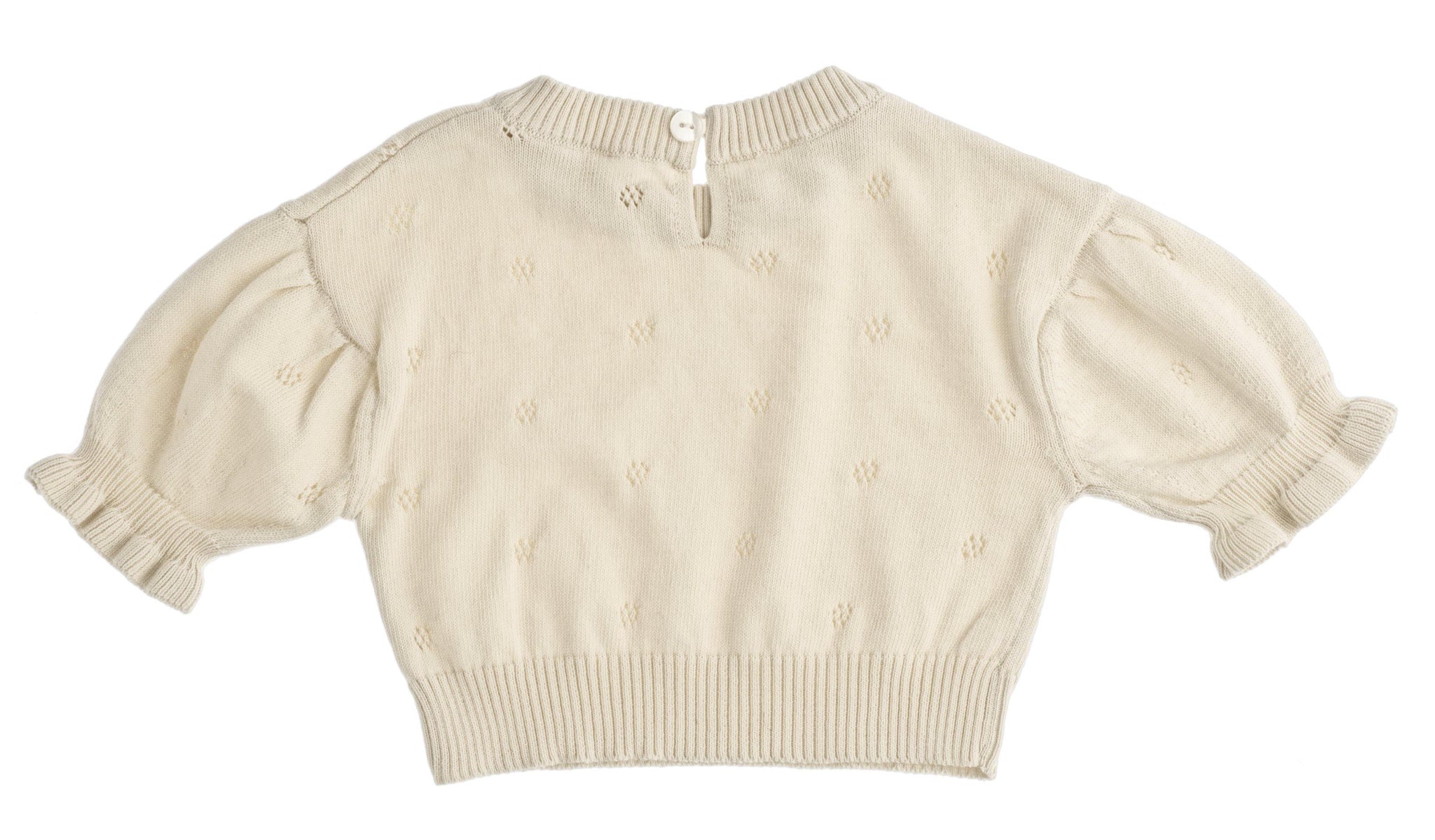 Crewneck light knit top crewneck with a button at the back. It has a ruffle at the sleeve and all over embroidery details.– 100% Cotton– Machine washable 40 degrees