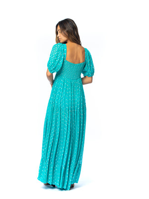 Turn heads in the Tolani Verena Dress, a maxi masterpiece that exudes elegance and effortless style. This flowy dress boasts a flattering square neck and a delicate sheer overlay that adds a touch of mystery. The teal base with a shimmering metallic print is sure to make you stand out from the crowd.