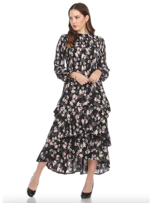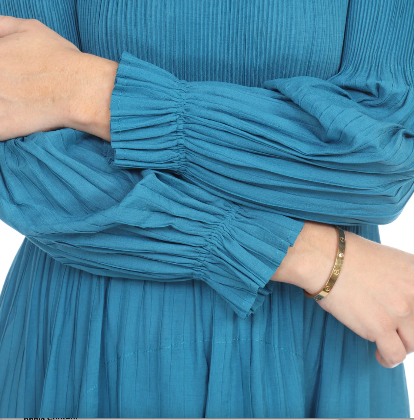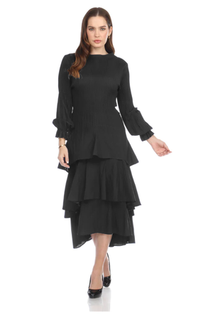 •LOOK: Veeca has done it again. We refer to this as the miracle dress. Once you put it on, you will understand. They use a unique technique with micropleating that enhances the fit of this dress. This version of the dress has a pull on style and high neckline. The long sleeves are also pleated and finish with a delicate ruffle. There are layers of ruffles that move and groove so gracefully with you. This dress is maxi length and the pleats gently open up as the layers cascade down. If you are familiar with the brand Veeca, here's one to add to your collection. Maybe stretch your limits a bit and try a different color. If you have never tried this brand before, there is no better time than the present for your next special occasion. This dress is a wonderful design and fit, created with just you in mind.